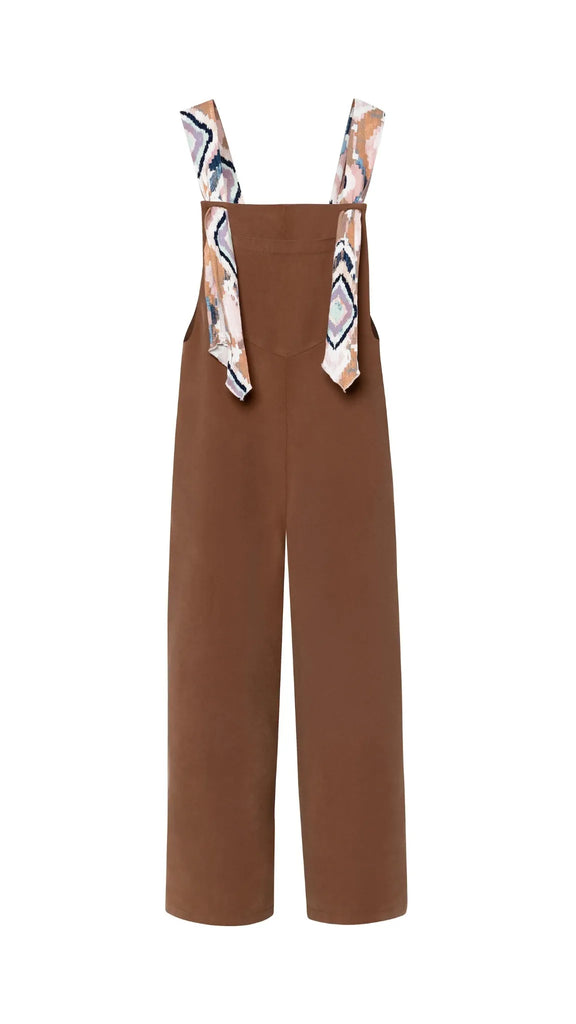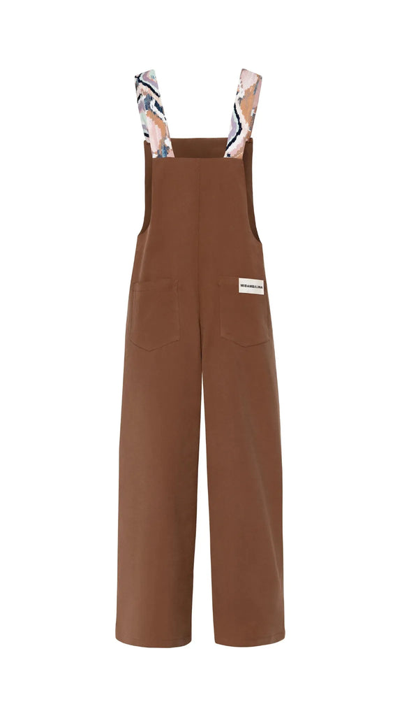 Mono largo color marrón y tirantes estampado en tonos rosas, beige, negro y blancos. Escote delantero recto con bolsillo delantero de plastrón. Pernera ancha con dos bolsillos de plastrón en la zona trasera.