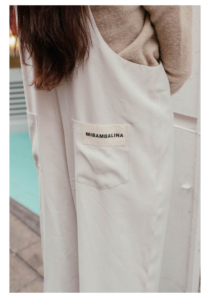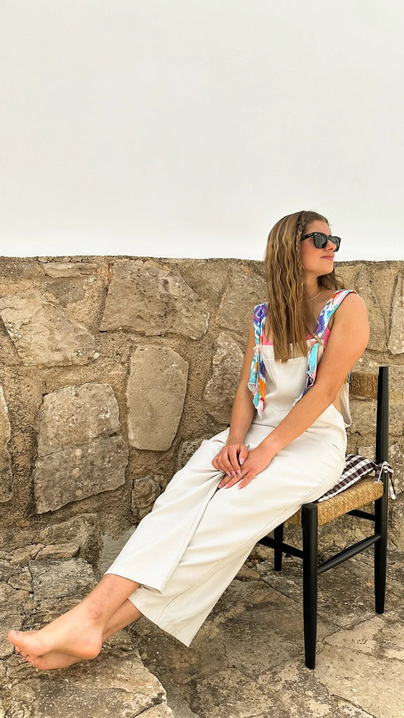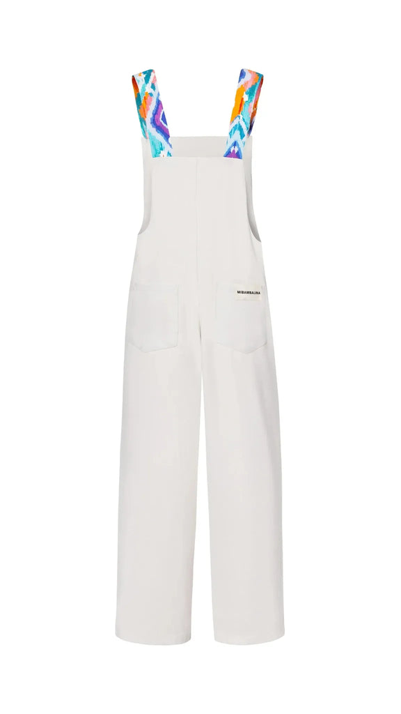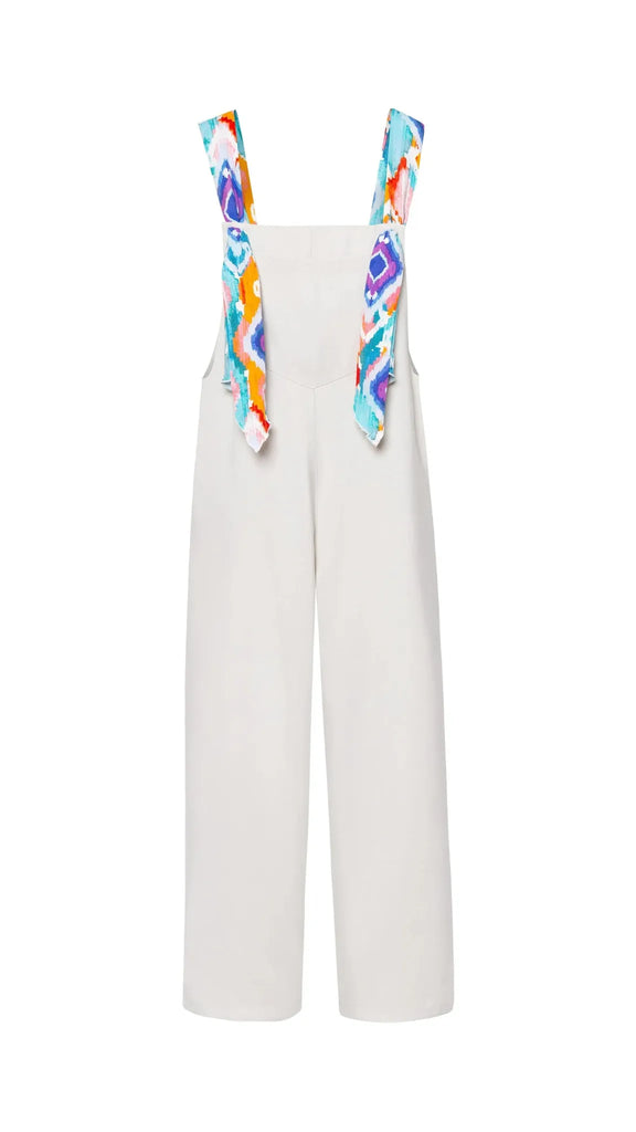 Mono largo color marfil y tirantes estampado en tonos azules y naranjas. Escote delantero recto con bolsillo delantero de plastrón. Pernera ancha con dos bolsillos de plastrón en la zona trasera.