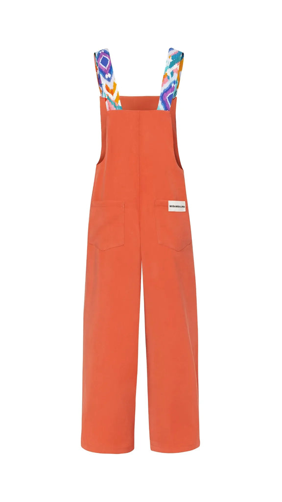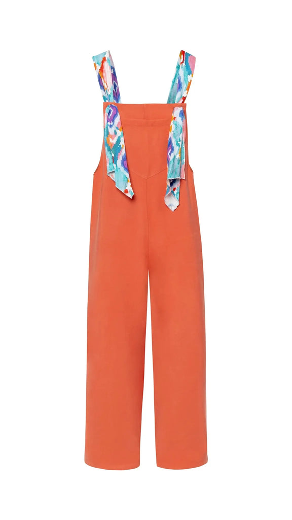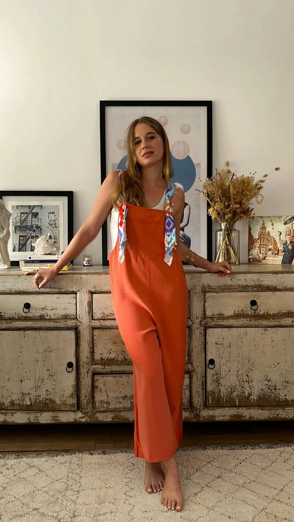 Mono largo color naranja suave y tirantes estampado en tonos azules y naranjas.
