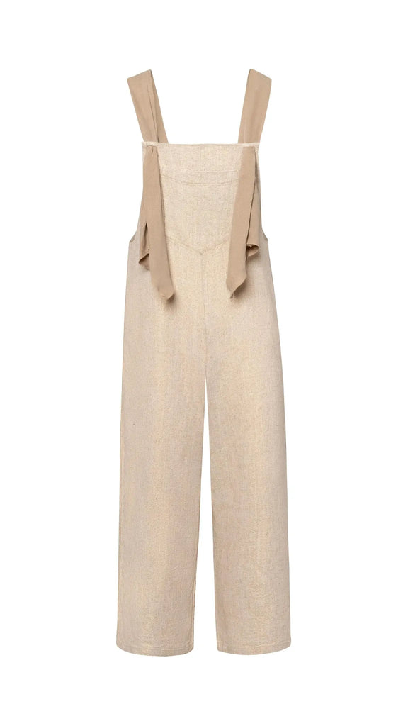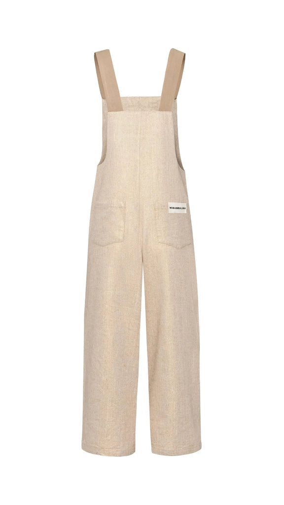 Mono largo en tonos dorados y tirantes color beige. Escote delantero recto con bolsillo delantero de plastrón. Pernera ancha con dos bolsillos de plastrón en la zona trasera.